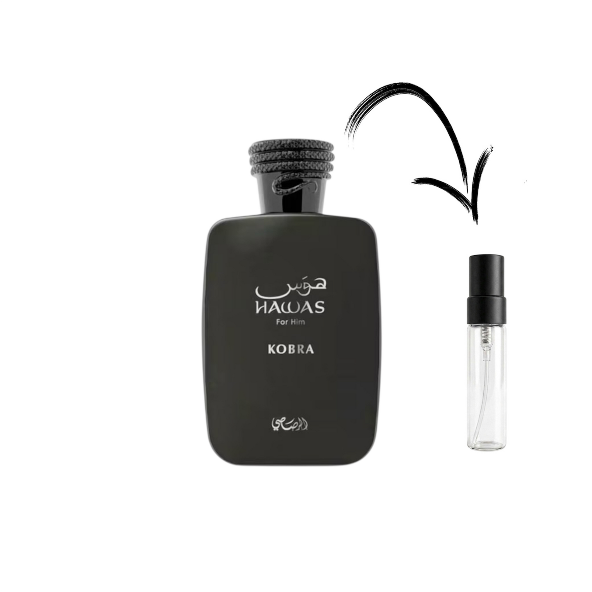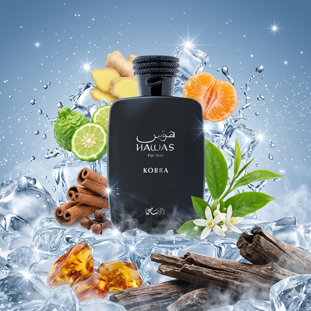 Hawas Kobra de Rasasi es una fragancia fresca, cítrica y especiada con un fondo amaderado y jabonoso. Vibrante y dinámica, combina la energía del jengibre y la bergamota con la sofisticación del té verde y el neroli, sobre una base cálida de almizcle y ámbar.